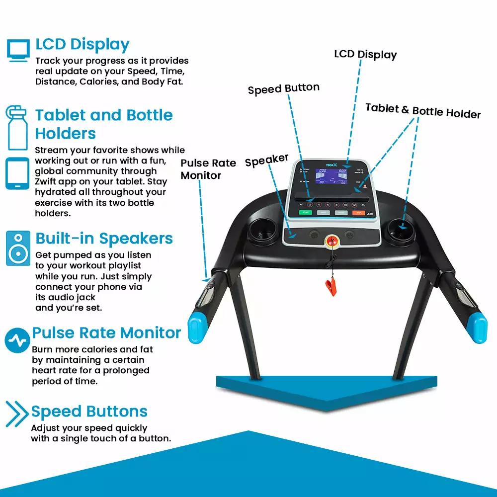 Monitor your Speed, Time, Distance, Calories, Body Fat, and Pulse using the LCD Display of the Trax Jogger 2.2 Treadmill. Download the FitShow or Zwift App to plan, record, and share your training online. - TABLET AND CUP HOLDER