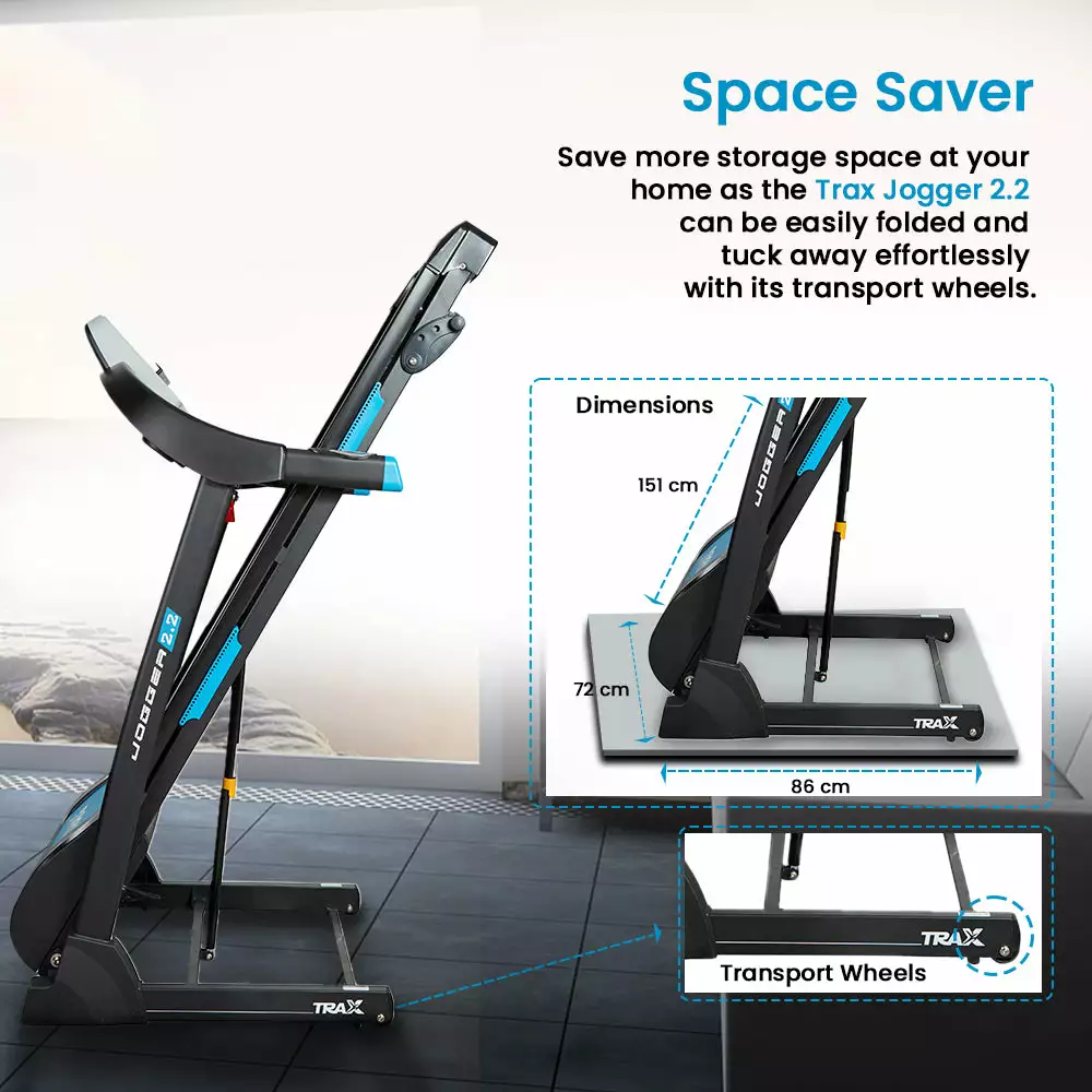 Get fit and achieve your fitness goals using the Trax Jogger 2.2. With its compact and foldable design, this space saver treadmill lets you exercise comfortably at your home. Experience a better cardio workout with Trax Jogger 2.2 Treadmill.