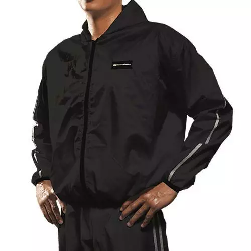 Fitness & Athletics Sauna Suit is made from a heavy-duty polyester material, complete with elastic cuff, hood, hand pockets, and zipper closure.