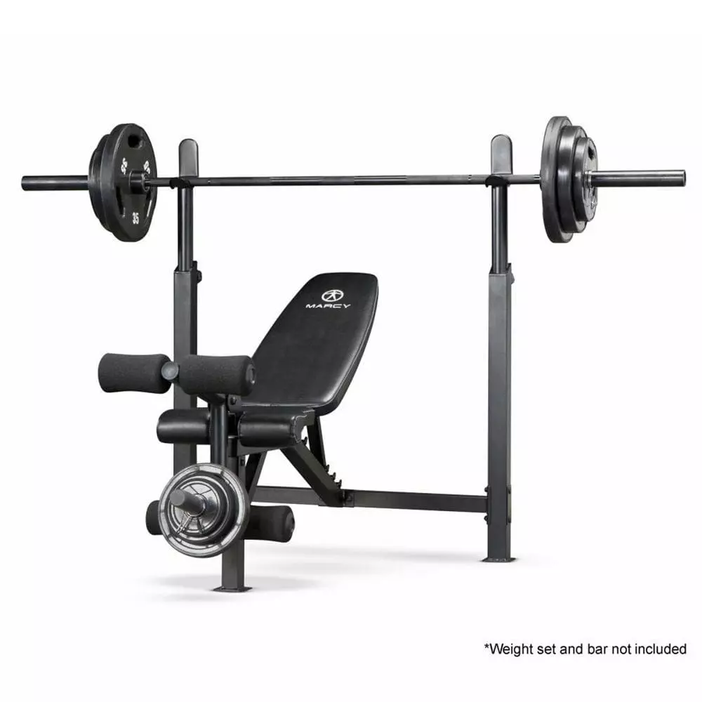 Achieve a total body workout using the Marcy Olympic Bench with Rack. You can do a variety of exercises like bench press, leg extensions, curls, and more on this multifunctional bench.