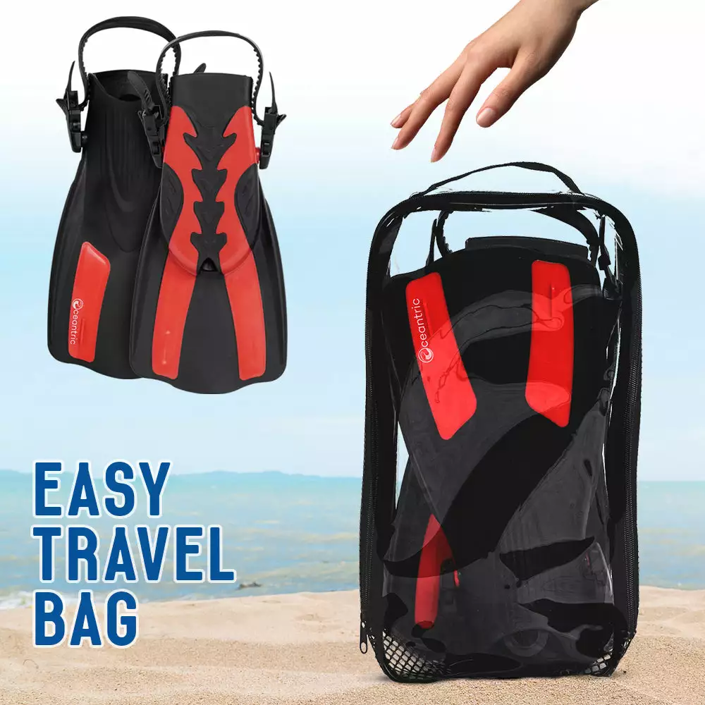 Oceantric Snorkel Fins are lightweight, compact and come with a mesh bag. Pack with ease and easily bring the beach trip or island vacation.Â