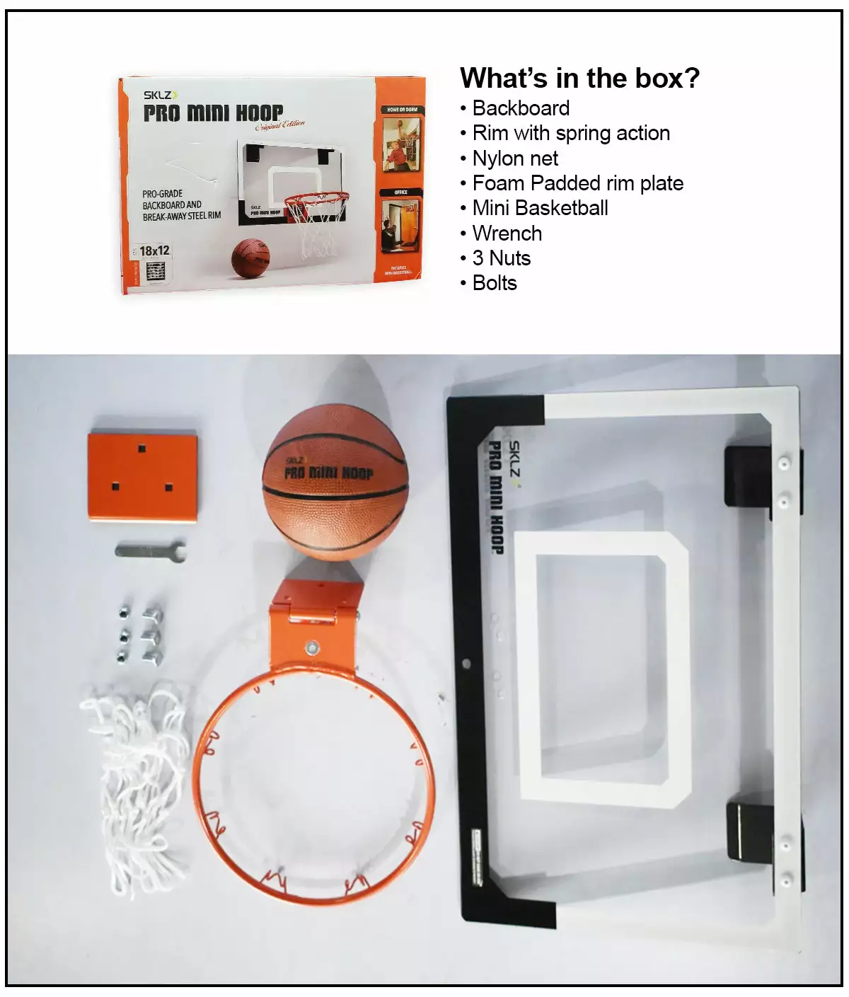 Anytime is game time with SKLZ Pro Mini Basketball Hoop! The indoor basketball ring can be easily installed to any house doors, shatterproof backboard, and comes with a 5-inch Mini Hoop Ball. Show your slam dunk moves in the dorm, office with a complete portable basketball set.