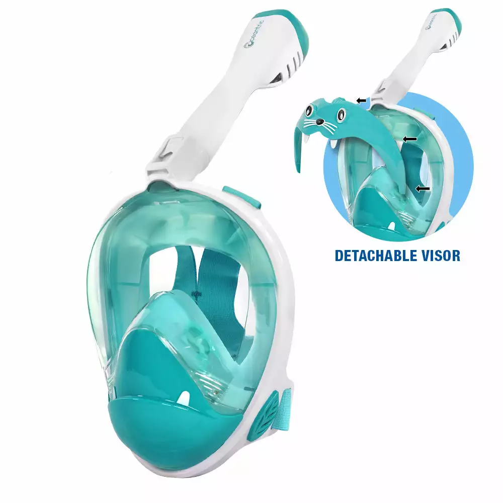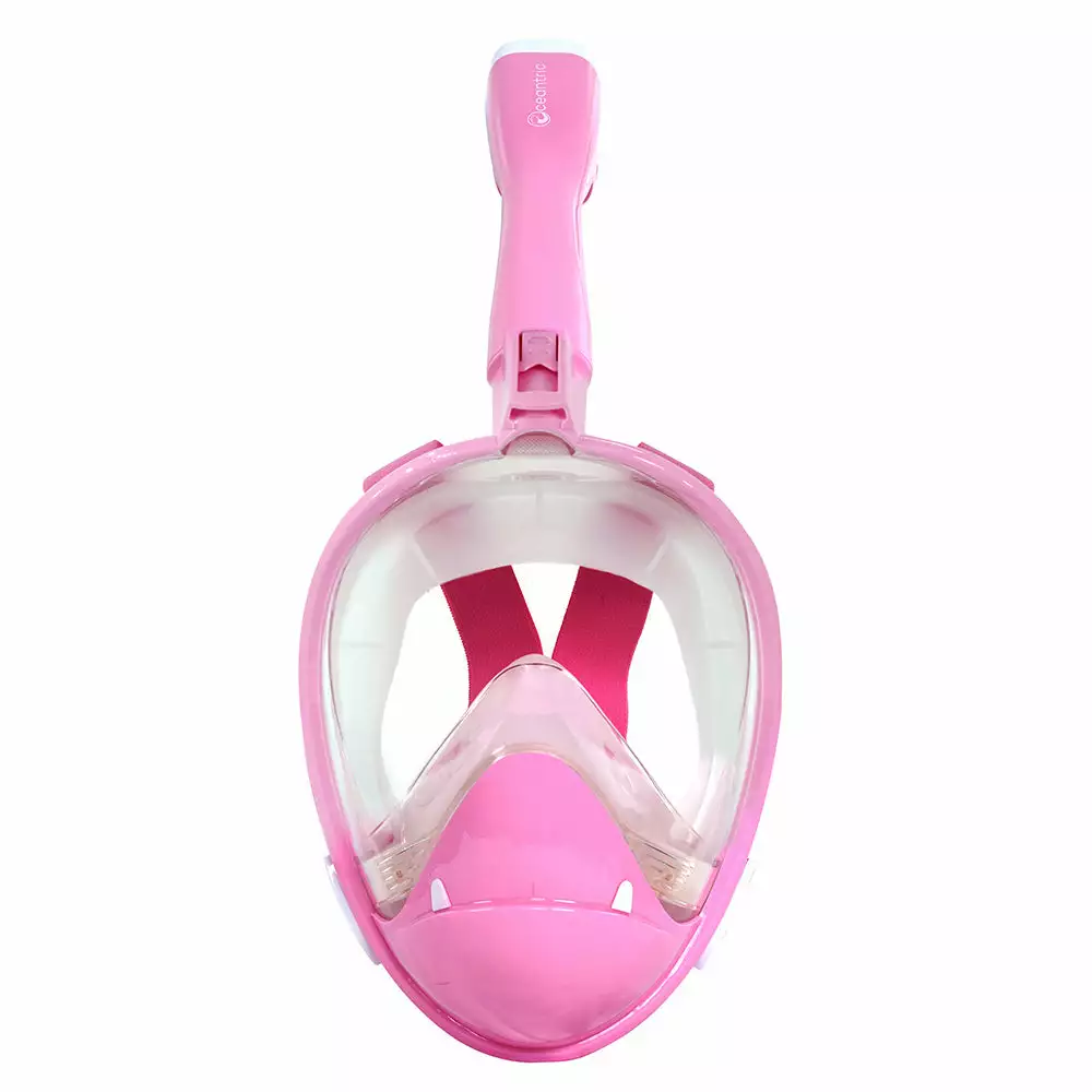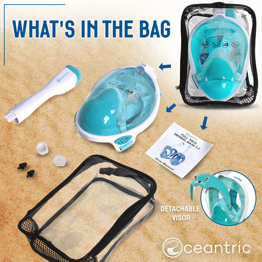 Experience the wonders of the sea with Oceantric Full Face Snorkel Mask 3.0. Swim safely and comfortably with the ergonomic breathing chamber, anti-fog technology, and slanted lens. The high-quality silicone snorkel mask is flexible, comfortable to wear for any face shape, and available in three sizes to fit kids up to adults.Â