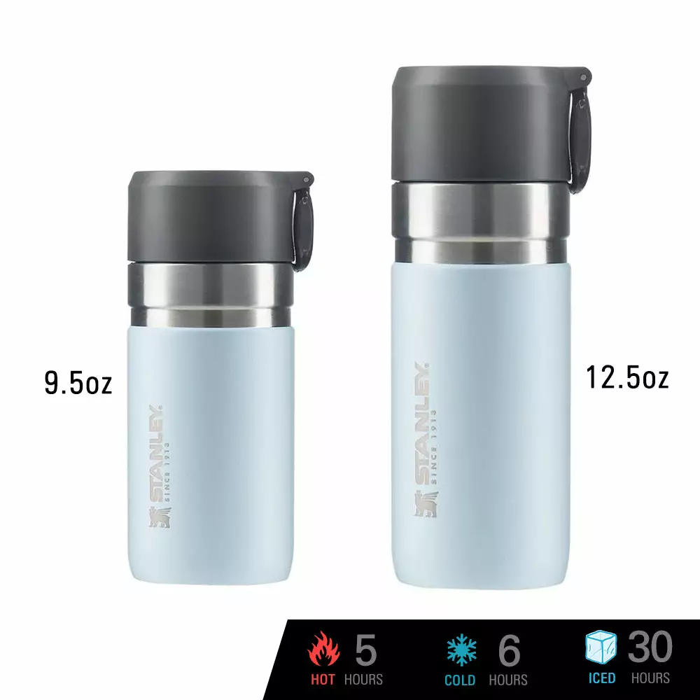 Stanley GO Vacuum Bottle keeps drinks hot for 5 hours, cold for 6 hours, and iced for 30 hours. Its superior insulation ensures that the bottle does not sweat even when filled with ice-cold drinks, nor does not become too hot to touch when filled with piping hot beverages.