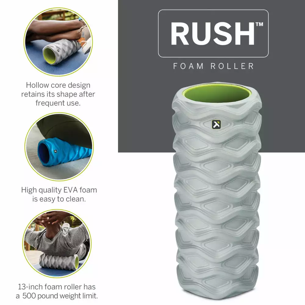 The Triggerpoint Rush Foam Roller is made with EVA Foam material, is easy to clean, and has a sweat resistant surface and ideal for workouts. - FIRM AND DURABLE